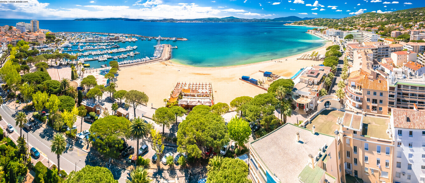 Town of Sainte Maxime beach and waterfront aerial panoramic view, south of France riviera -