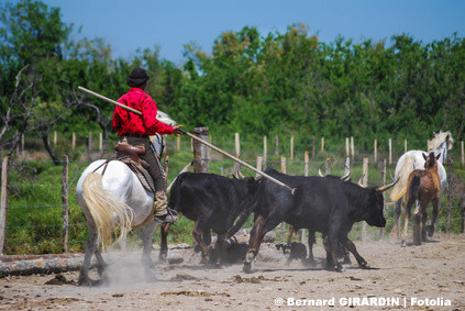 Petit déjeuner à votre hôtel. Départ pour une demi-journée camarguaise: accueil par le manadier, présentation de la manade par les cavaliers, visite du domaine en charrette, explications des coutumes, traditions, de la monte Camargue, de l’élevage de taureaux. Jeux de gardians, course de vachettes dans le « Bouvaou », apéritif et repas de midi. L’après-midi, visite des SAINTES-MARIES-DE-LA-MER et de son église qui abrite le tombeau de Ste-Sarah, reine des gitans. Temps libre aux Saintes-Maries-de-la-Mer. Retour à votre hôtel, repas du soir et nuitée.